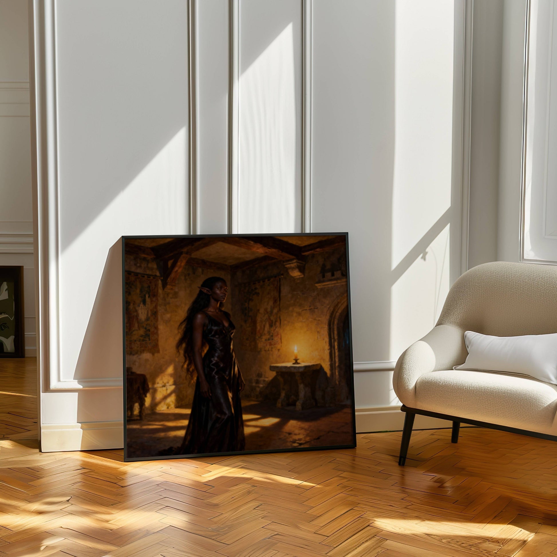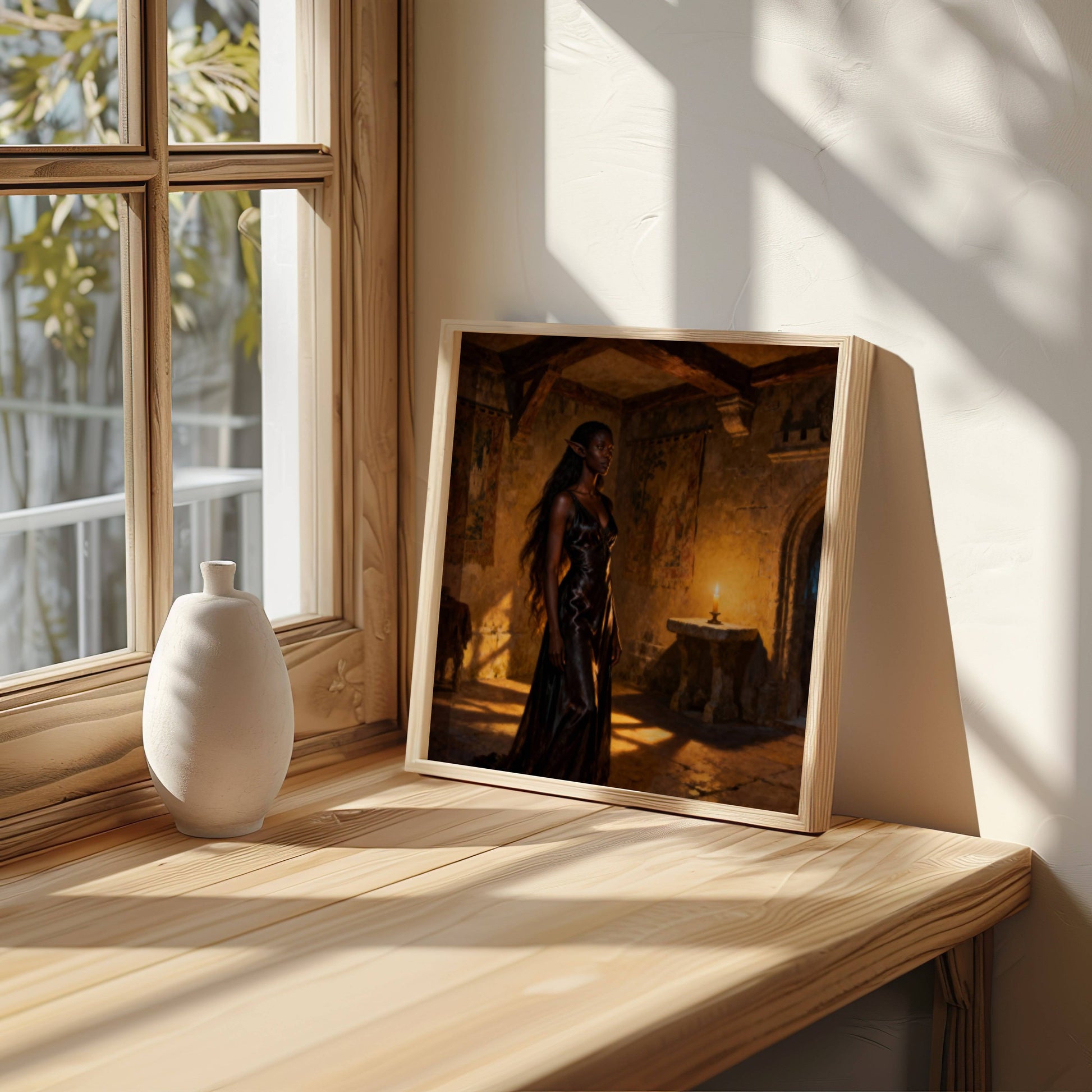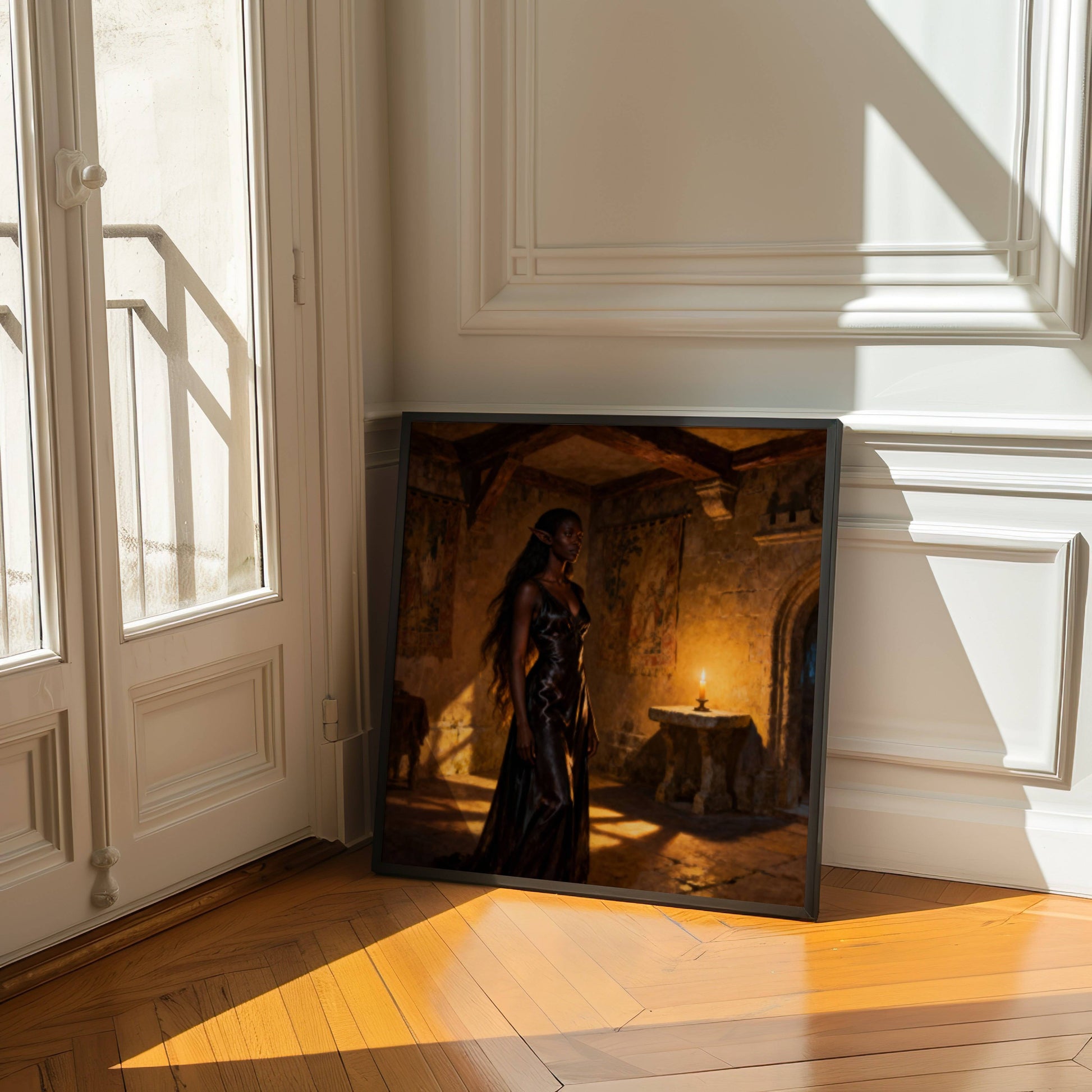 High elf waiting to see the elf council in a old castle building , original wall art print download